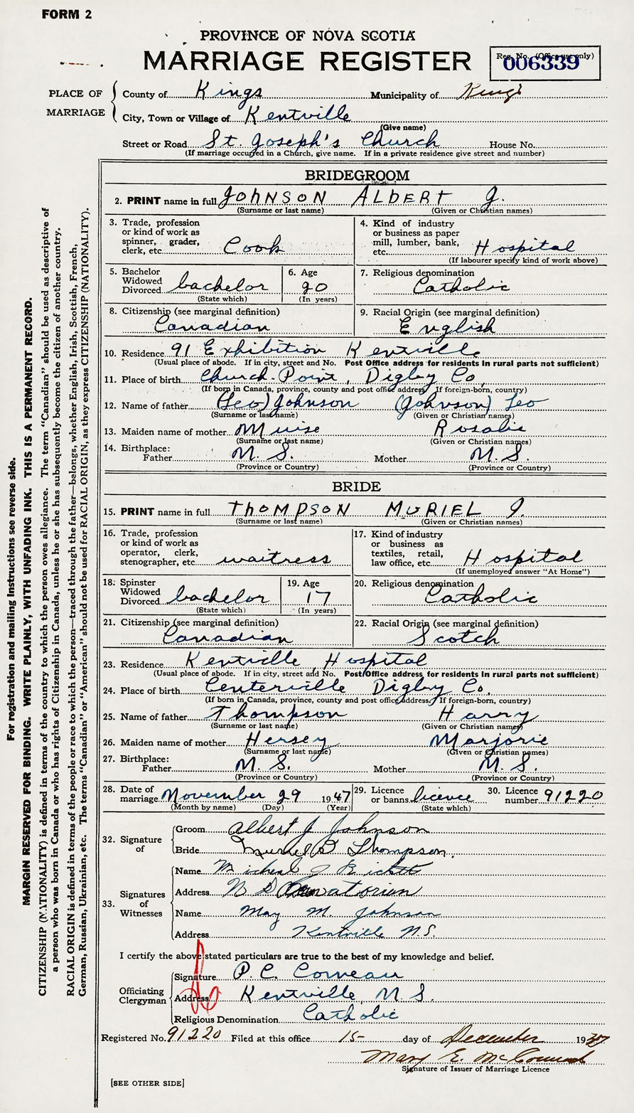 28. Date of marriage November 29 1947 29. By license or banns License 30. License number 91220