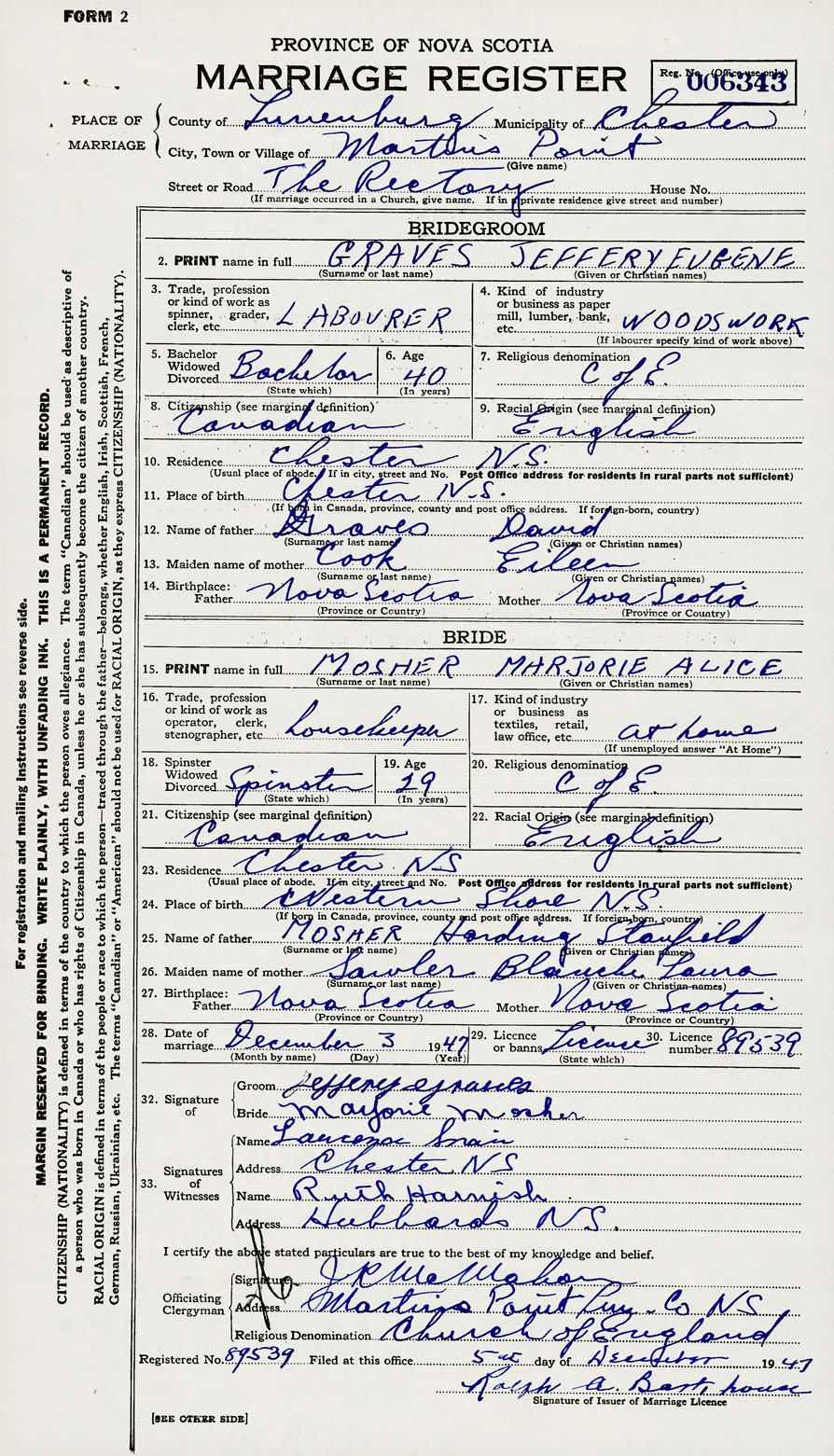 28. Date of marriage December 3 1947 29. By license or banns License 30. License number 89539