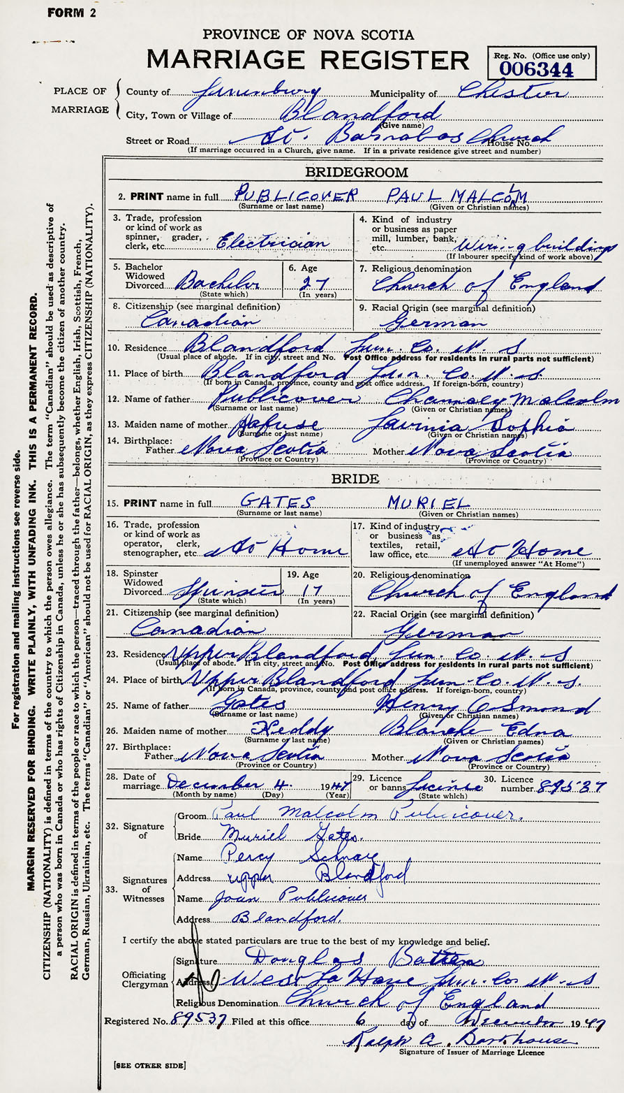 28. Date of marriage December 4 1947 29. By license or banns License 30. License number 89537