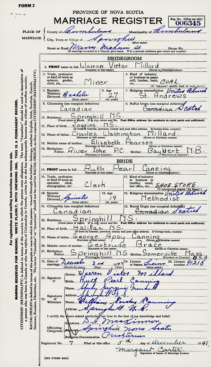 28. Date of marriage December 3 1947 29. By license or banns License 30. License number 91215