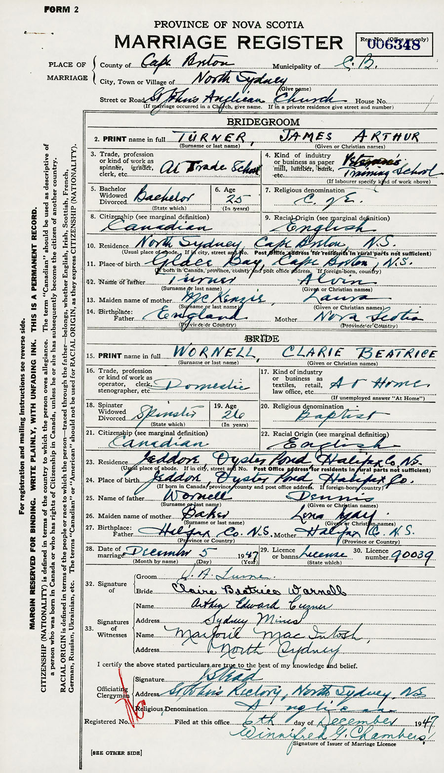 28. Date of marriage December 5 1947 29. By license or banns License 30. License number 90039