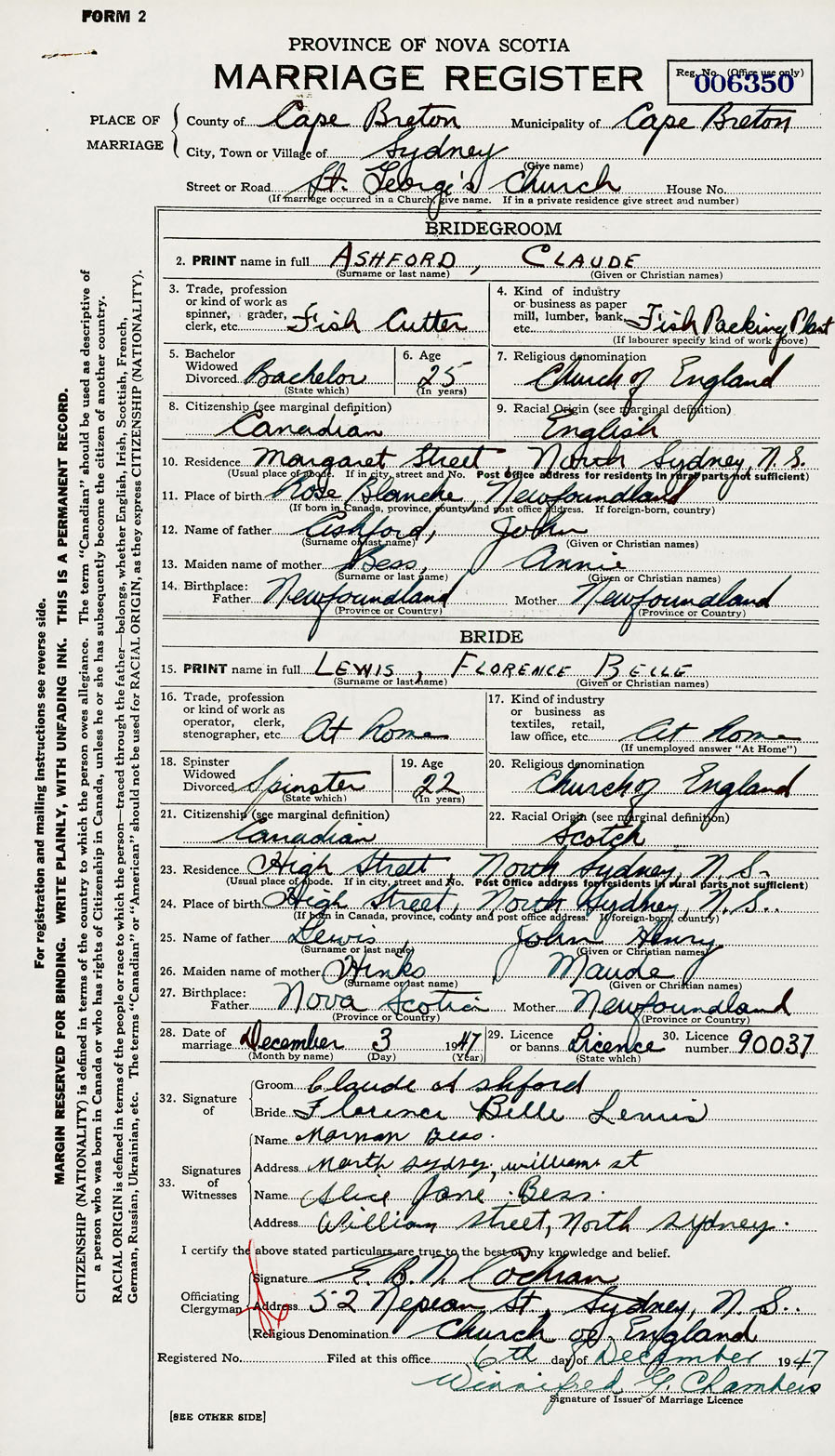 28. Date of marriage December 3 1947 29. By license or banns License 30. License number 90037