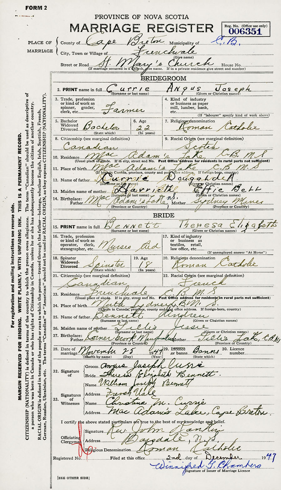 11. Place of birth MacAdam's Lake, Cape BretonN.S