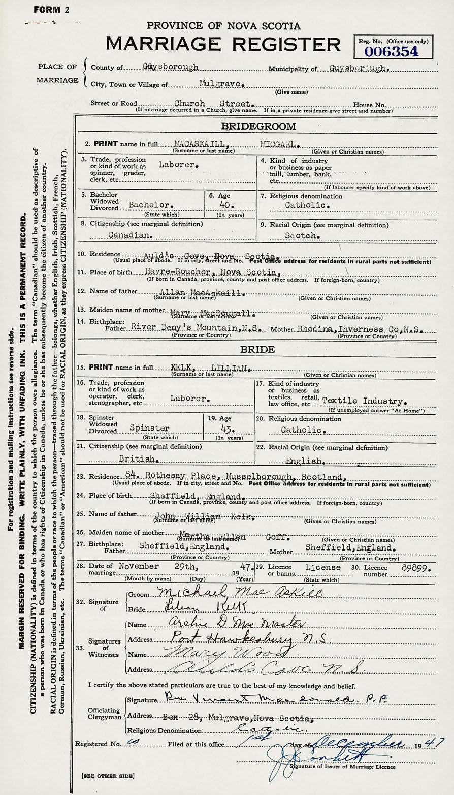 28. Date of marriage November 29 1947 29. By license or banns License 30. License number 89899