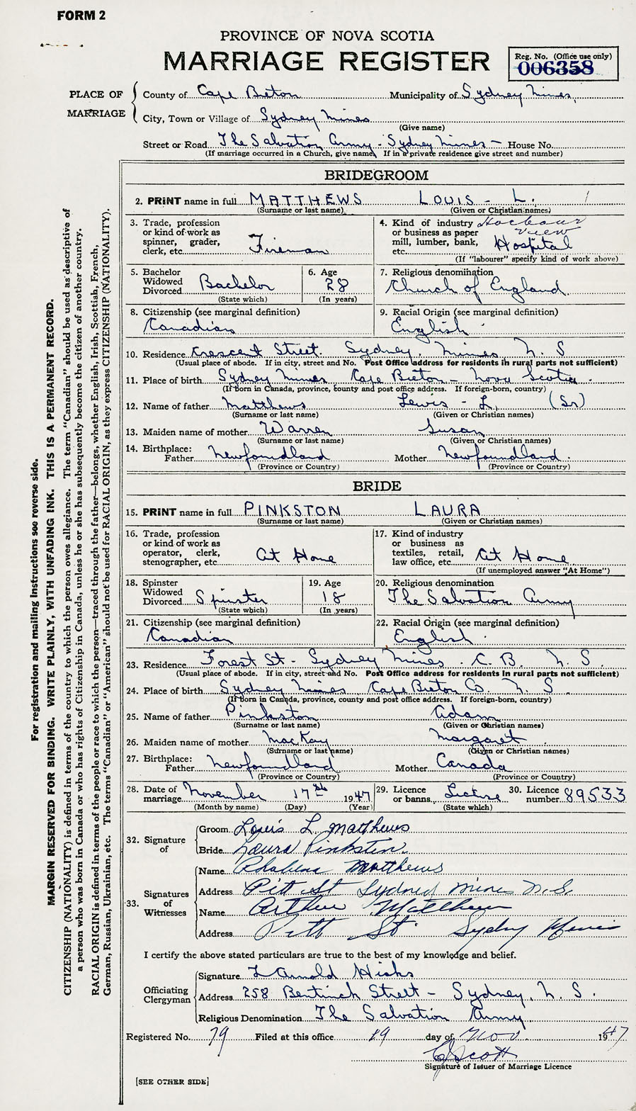 28. Date of marriage November 17 1947 29. By license or banns License 30. License number 89533