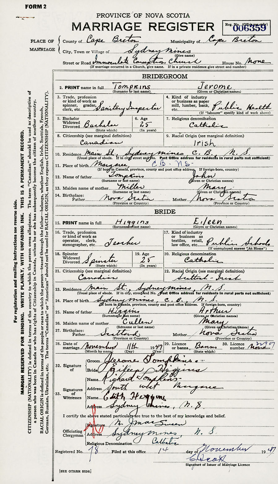 28. Date of marriage November 11 1947 29. By license or banns License 30. License number