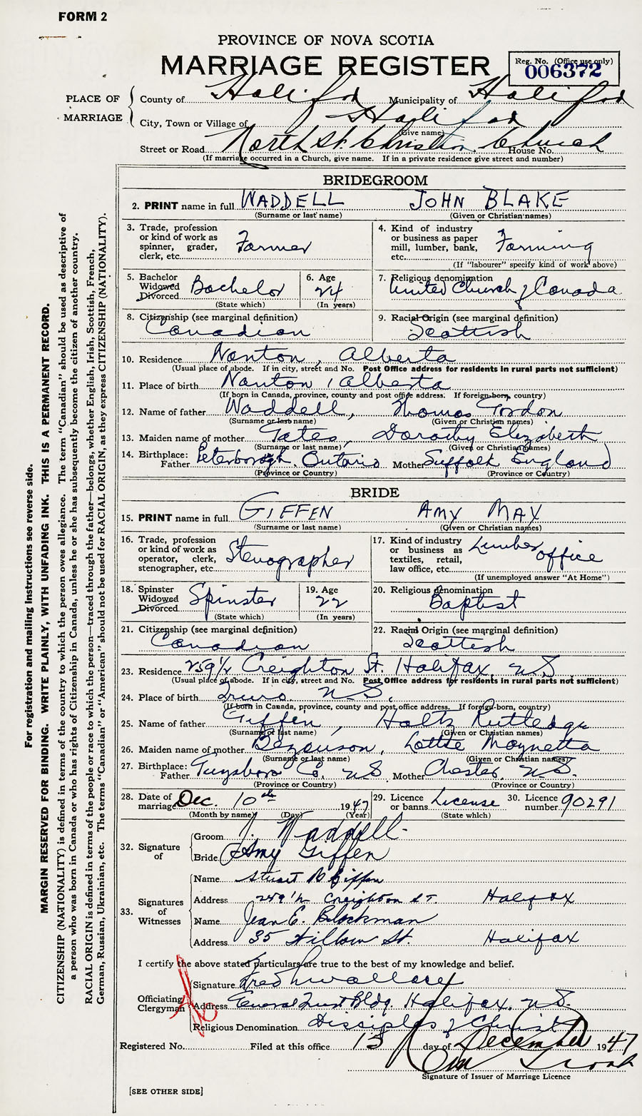 28. Date of marriage December 10 1947 29. By license or banns License 30. License number 90291