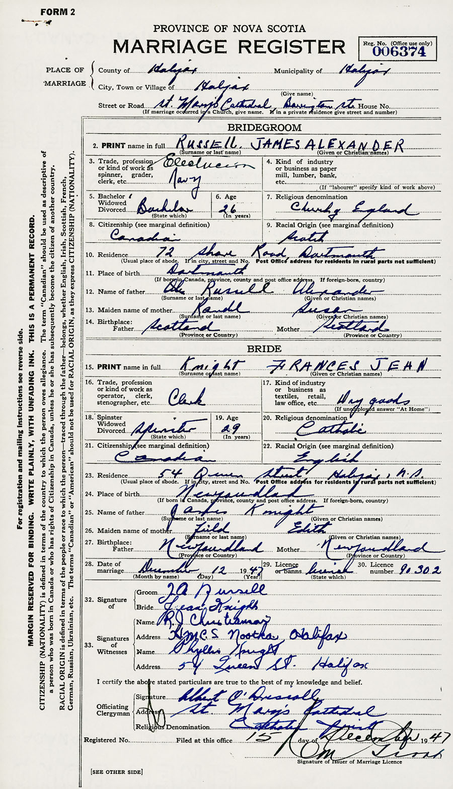 28. Date of marriage December 12 1947 29. By license or banns License 30. License number 91302