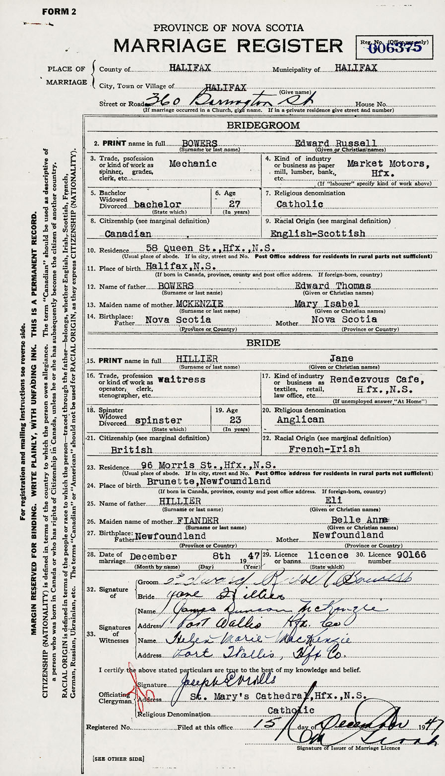28. Date of marriage December 8 1947 29. By license or banns License 30. License number 90166