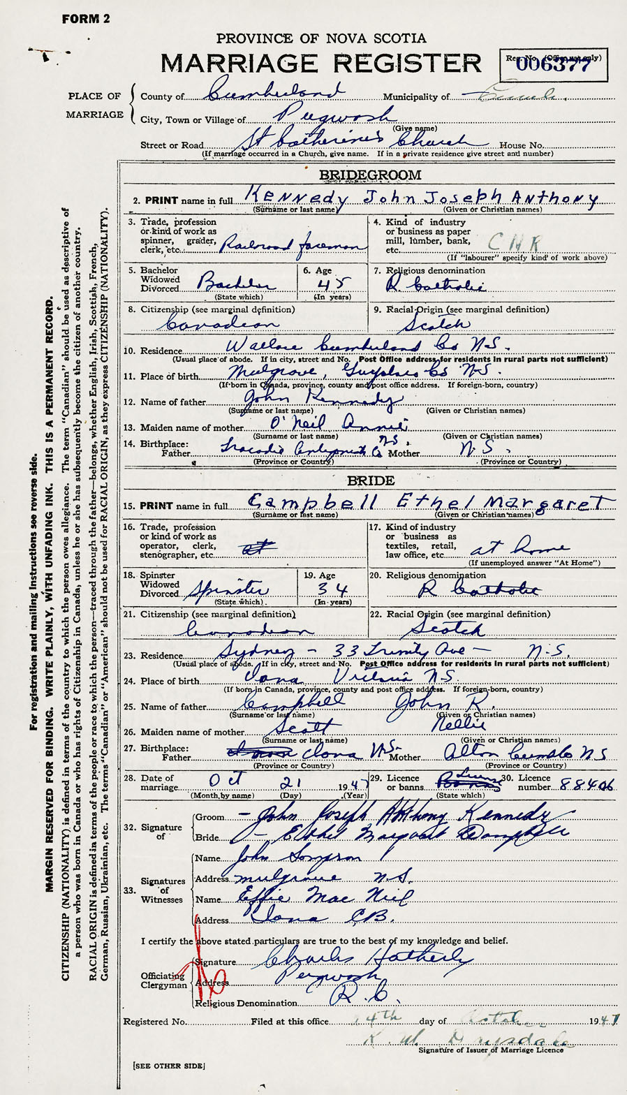 28. Date of marriage October 21 1947 29. By license or banns License 30. License number 88406