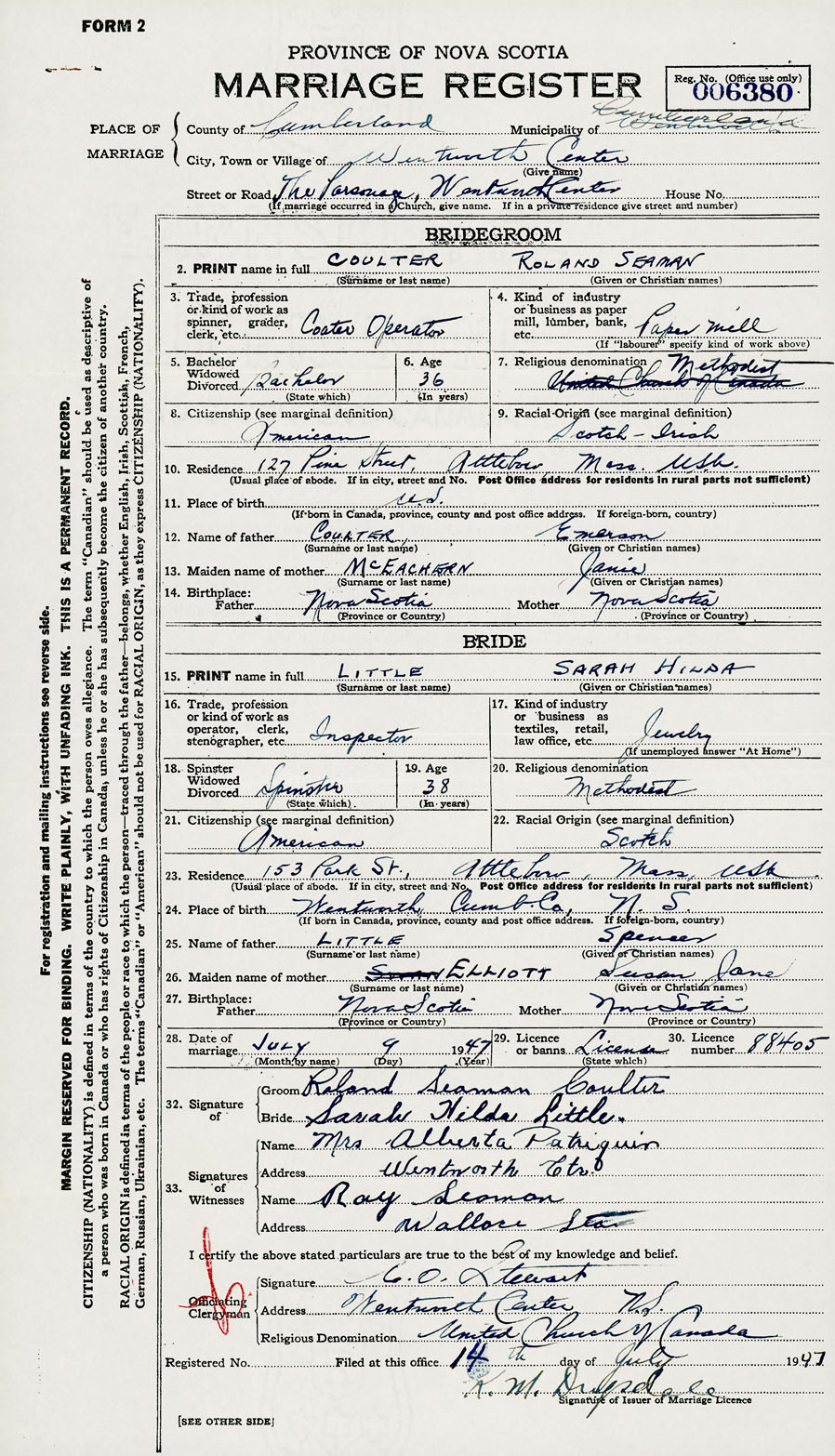 28. Date of marriage July 9 1947 29. By license or banns License 30. License number 88405
