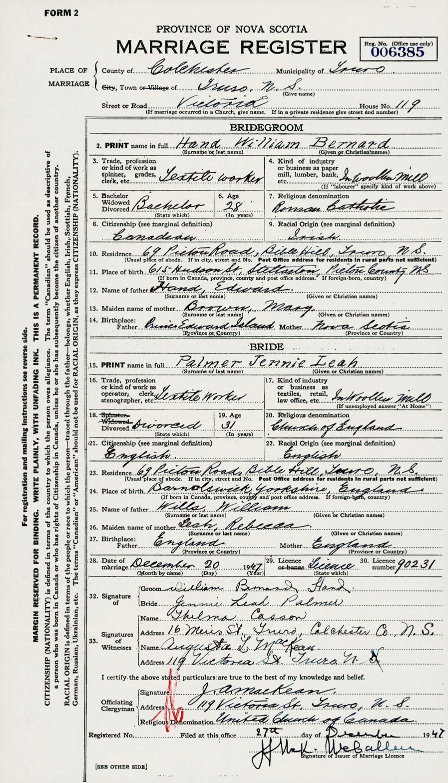 28. Date of marriage December 20 1947 29. By license or banns License 30. License number 90231