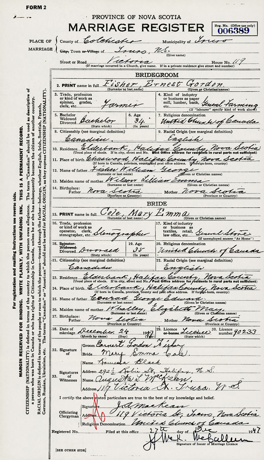 28. Date of marriage December 24 1947 29. By license or banns License 30. License number 90233