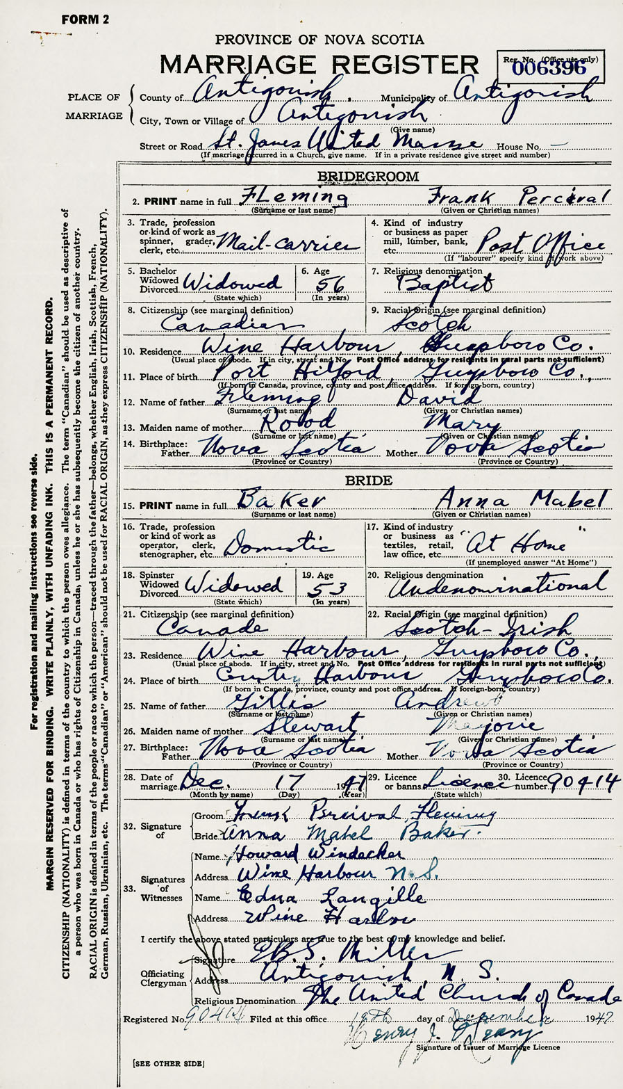 28. Date of marriage December 17 1947 29. By license or banns License 30. License number 90414