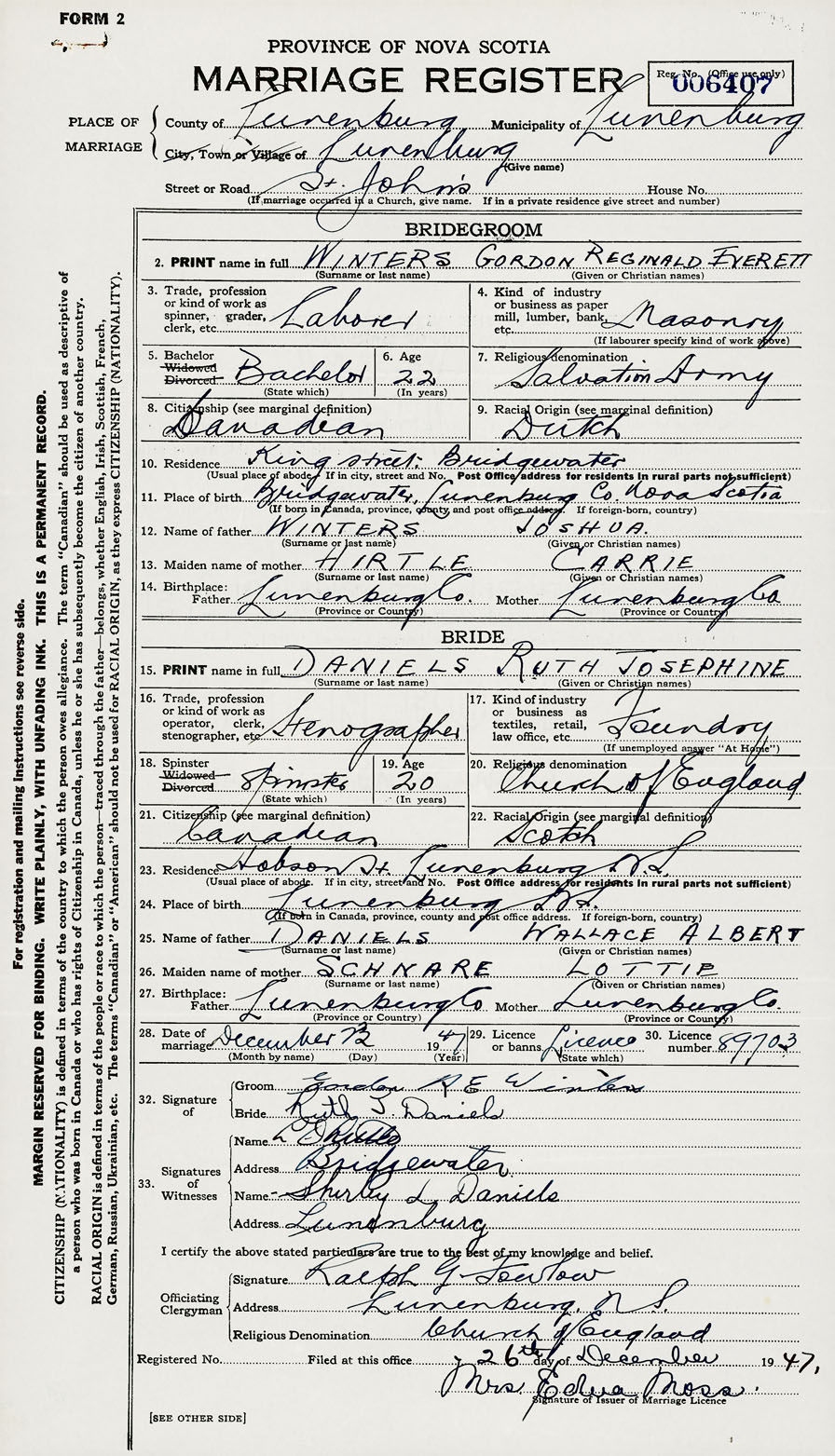 28. Date of marriage December 23 1947 29. By license or banns License 30. License number 89703