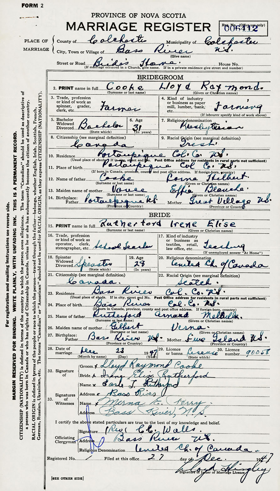 28. Date of marriage December 23 1947 29. By license or banns License 30. License number 90058
