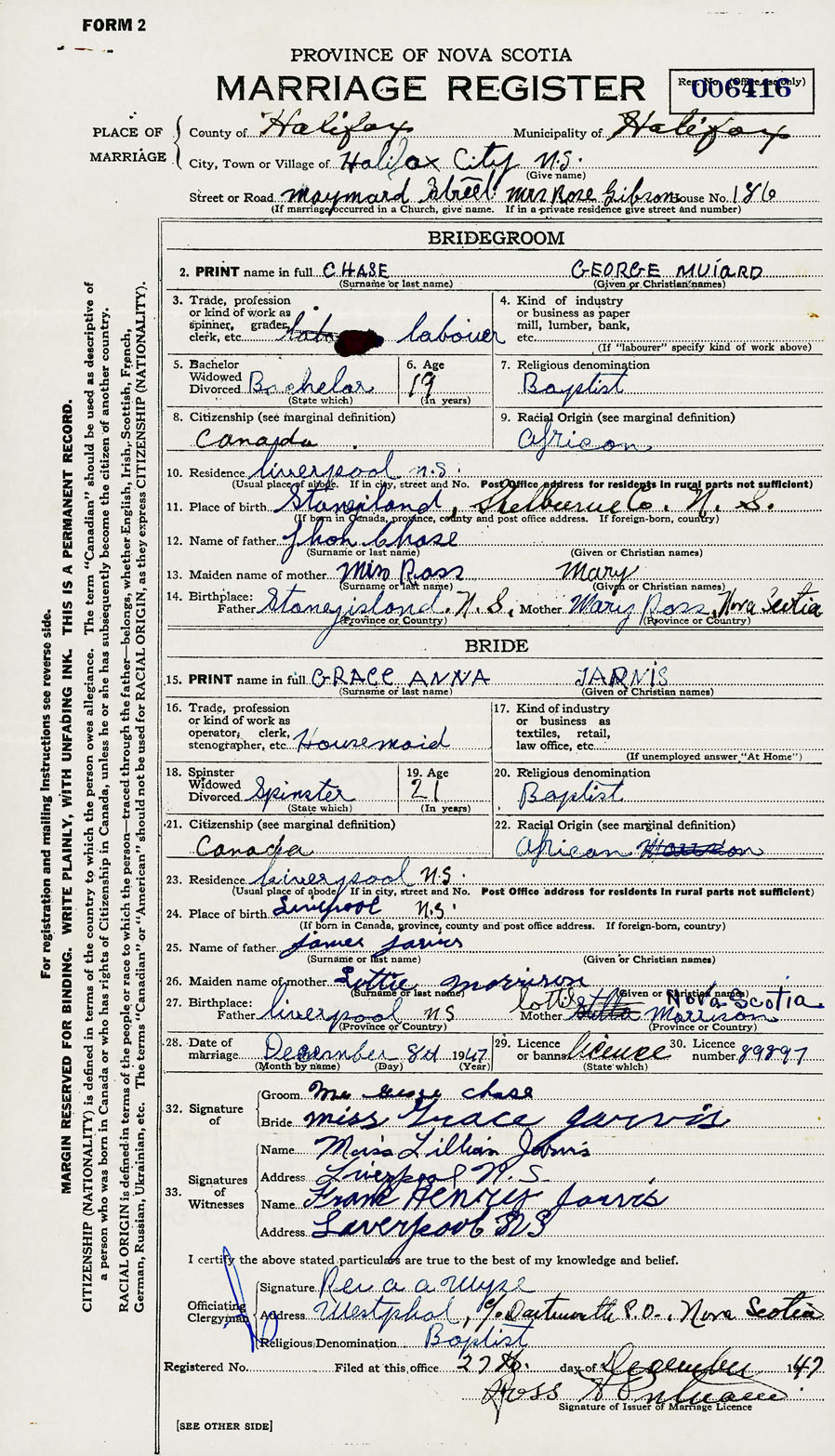 28. Date of marriage December 8 1947 29. By license or banns License 30. License number 89897