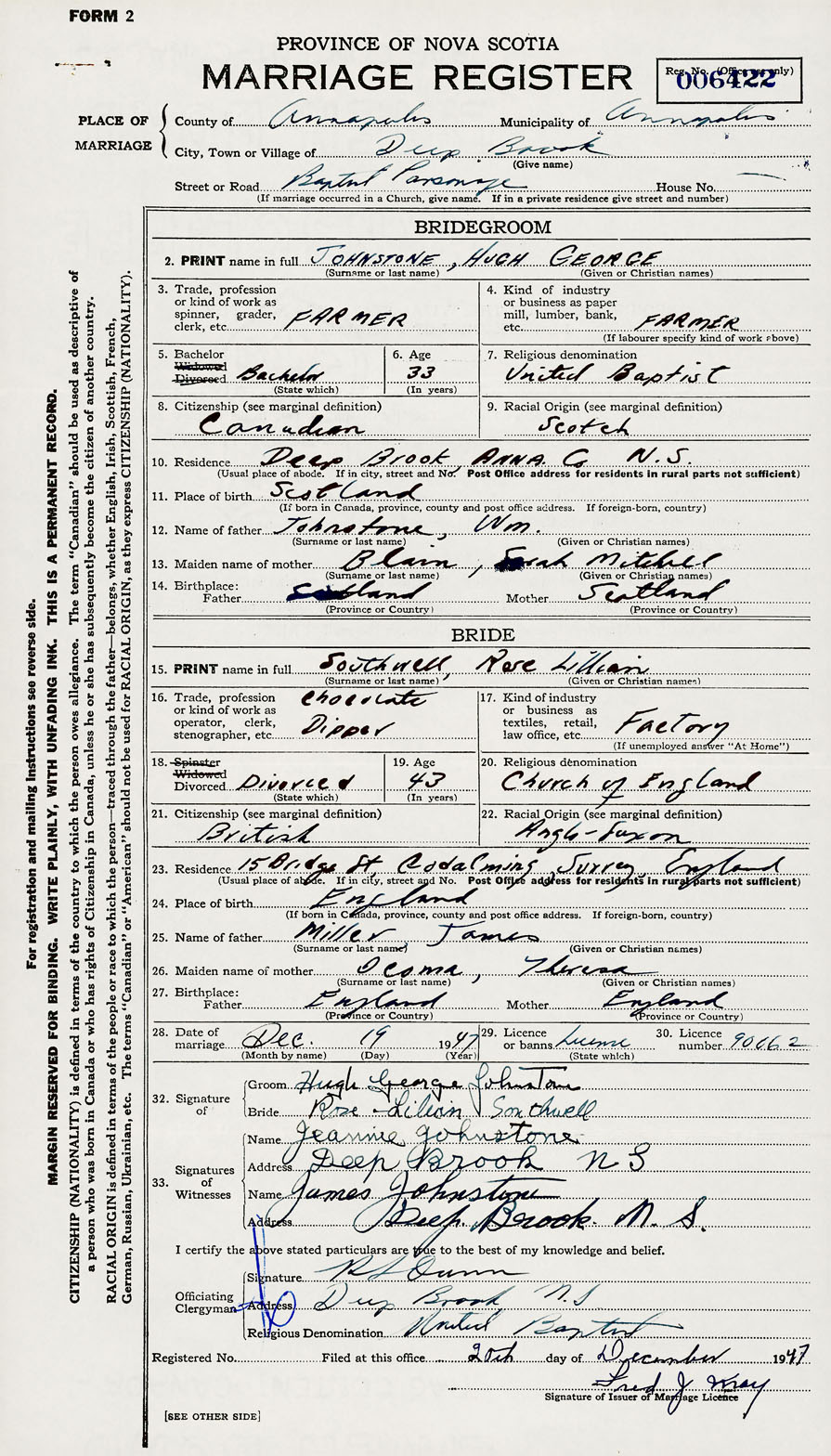 28. Date of marriage December 19 1947 29. By license or banns License 30. License number 90062