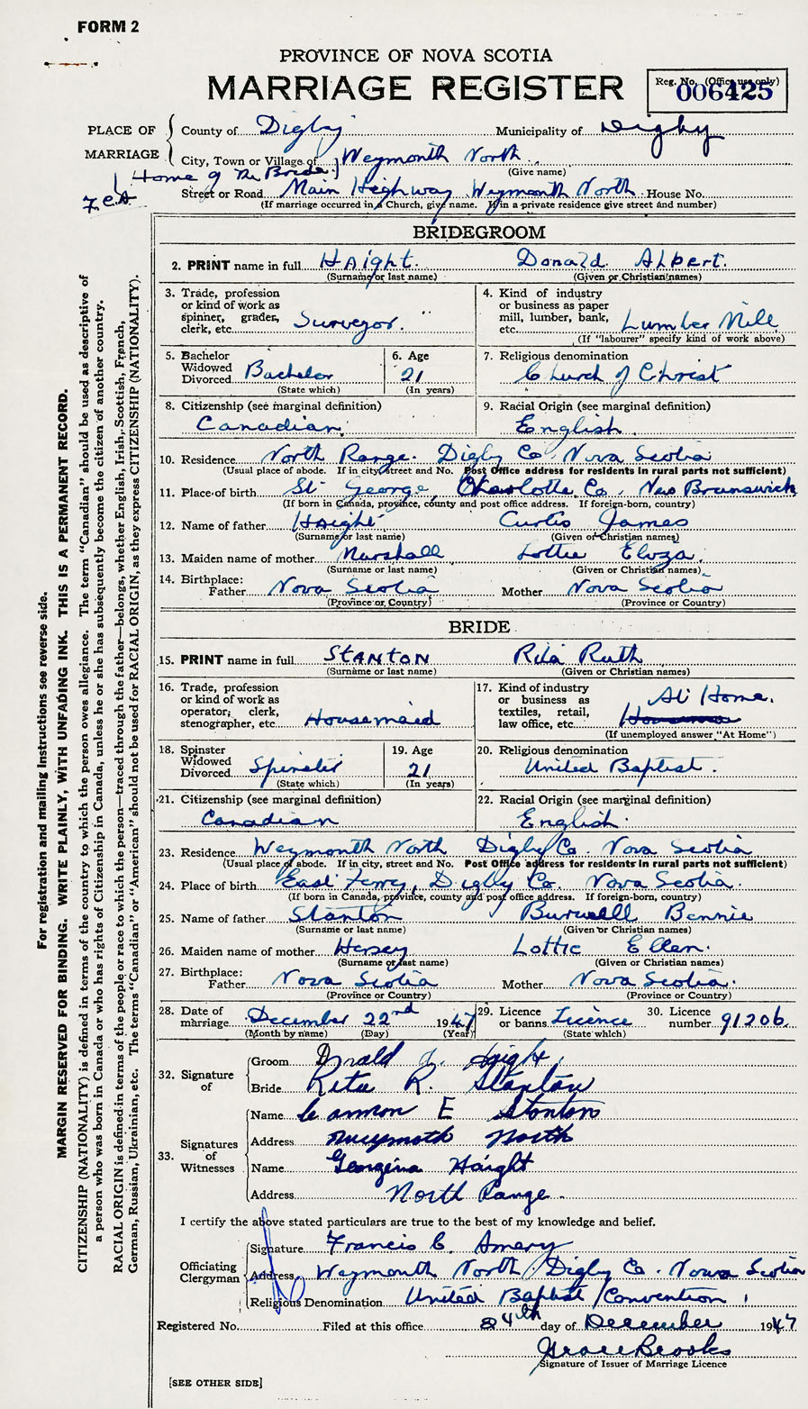 28. Date of marriage December 22 1947 29. By license or banns License 30. License number 91206