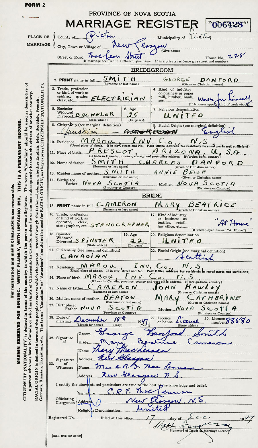 28. Date of marriage December 15 1947 29. By license or banns License 30. License number 88580
