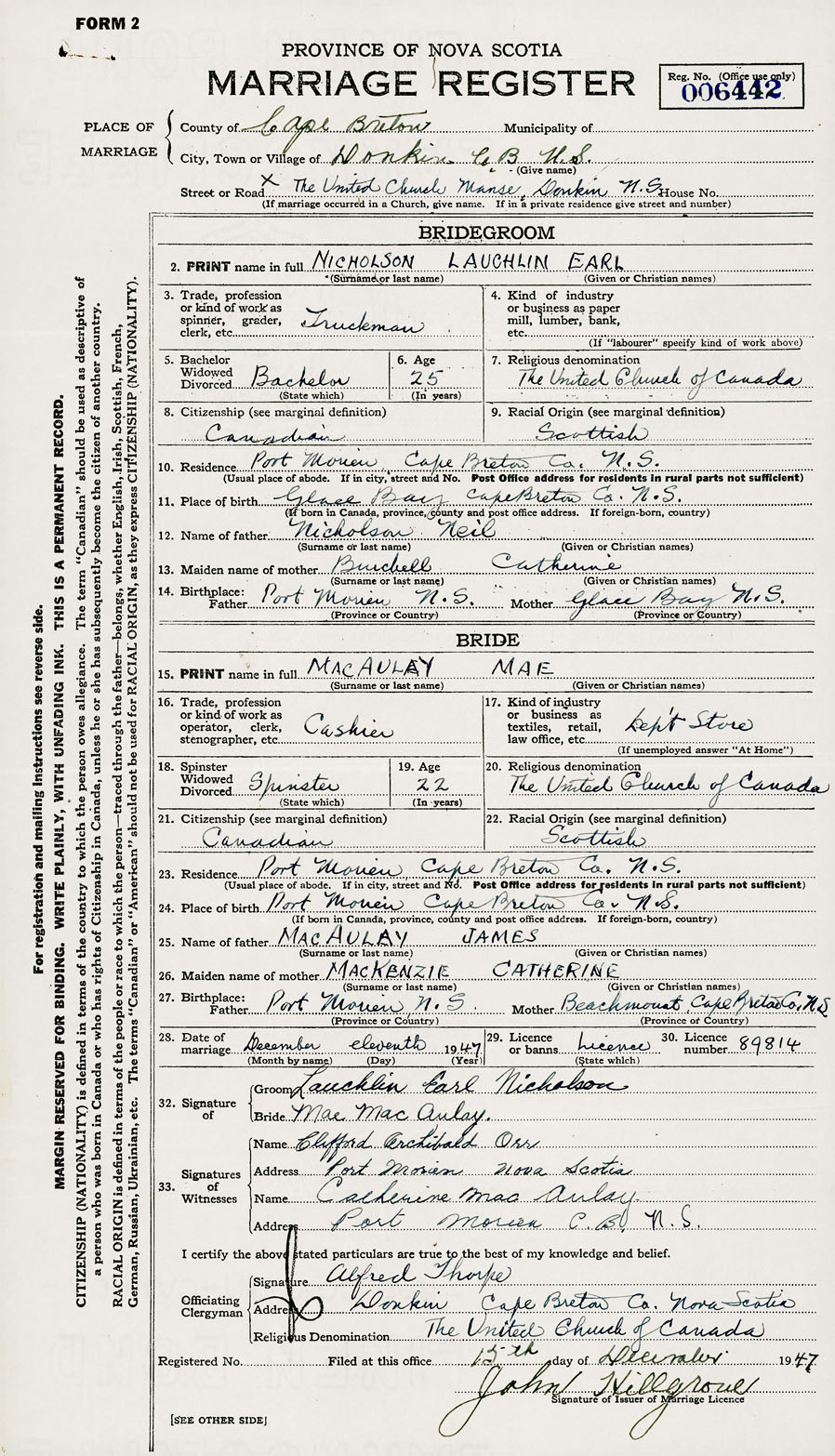 28. Date of marriage December 11 1947 29. By license or banns License 30. License number 89814