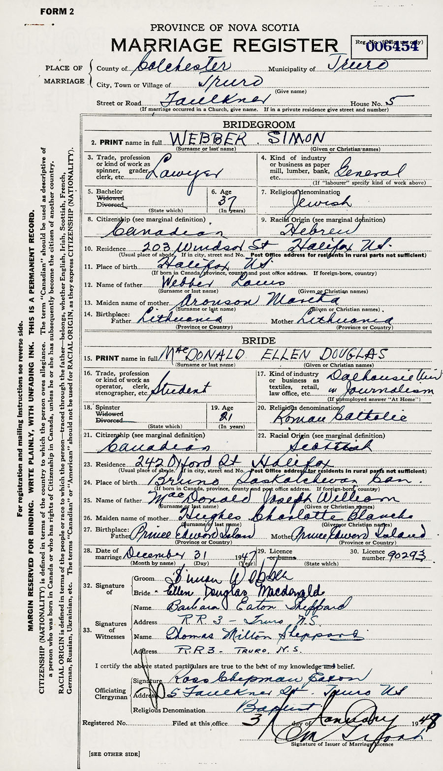 28. Date of marriage December 31 1947 29. By license or banns License 30. License number 90293