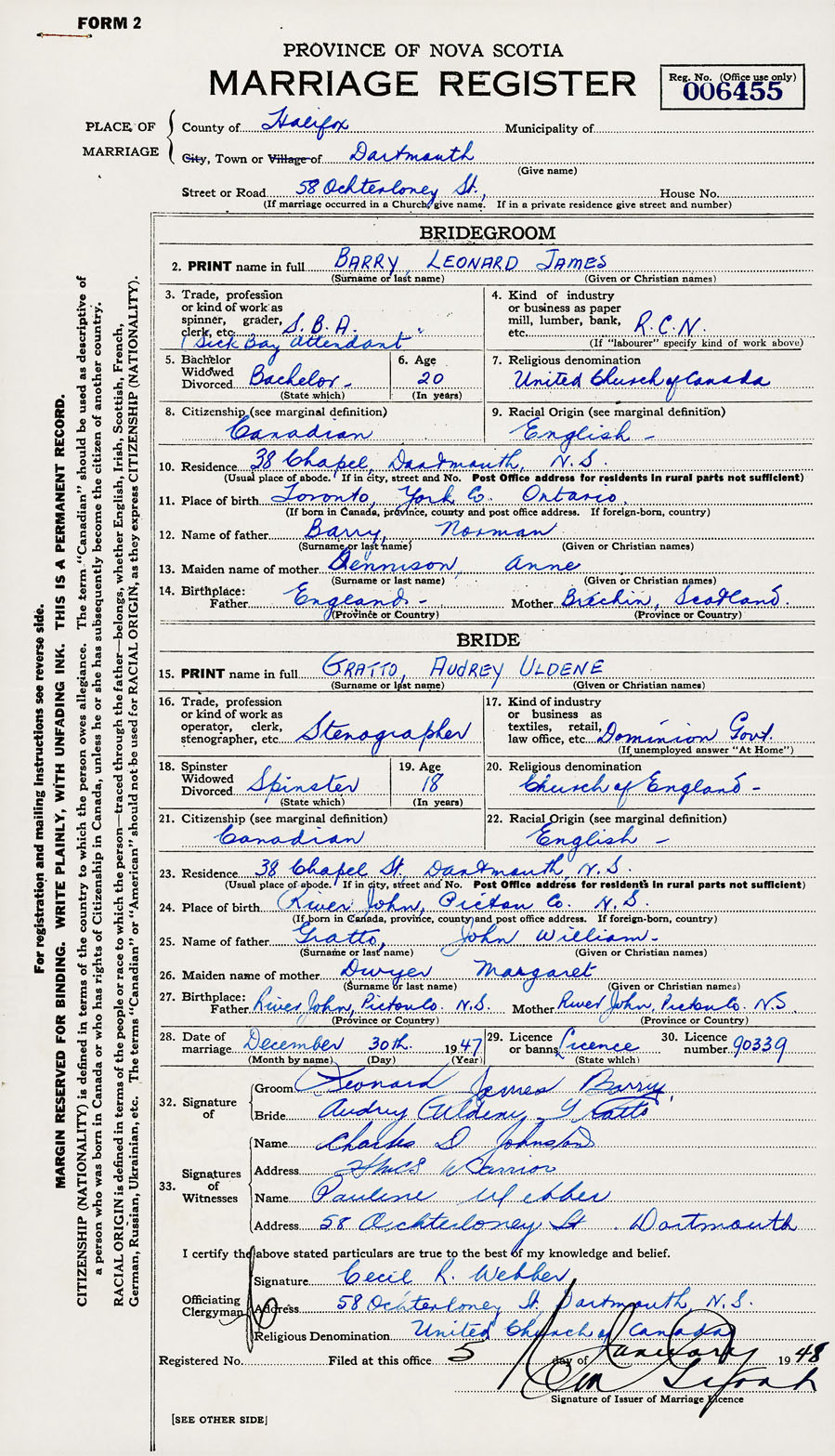 28. Date of marriage December 30 1947 29. By license or banns License 30. License number 90339
