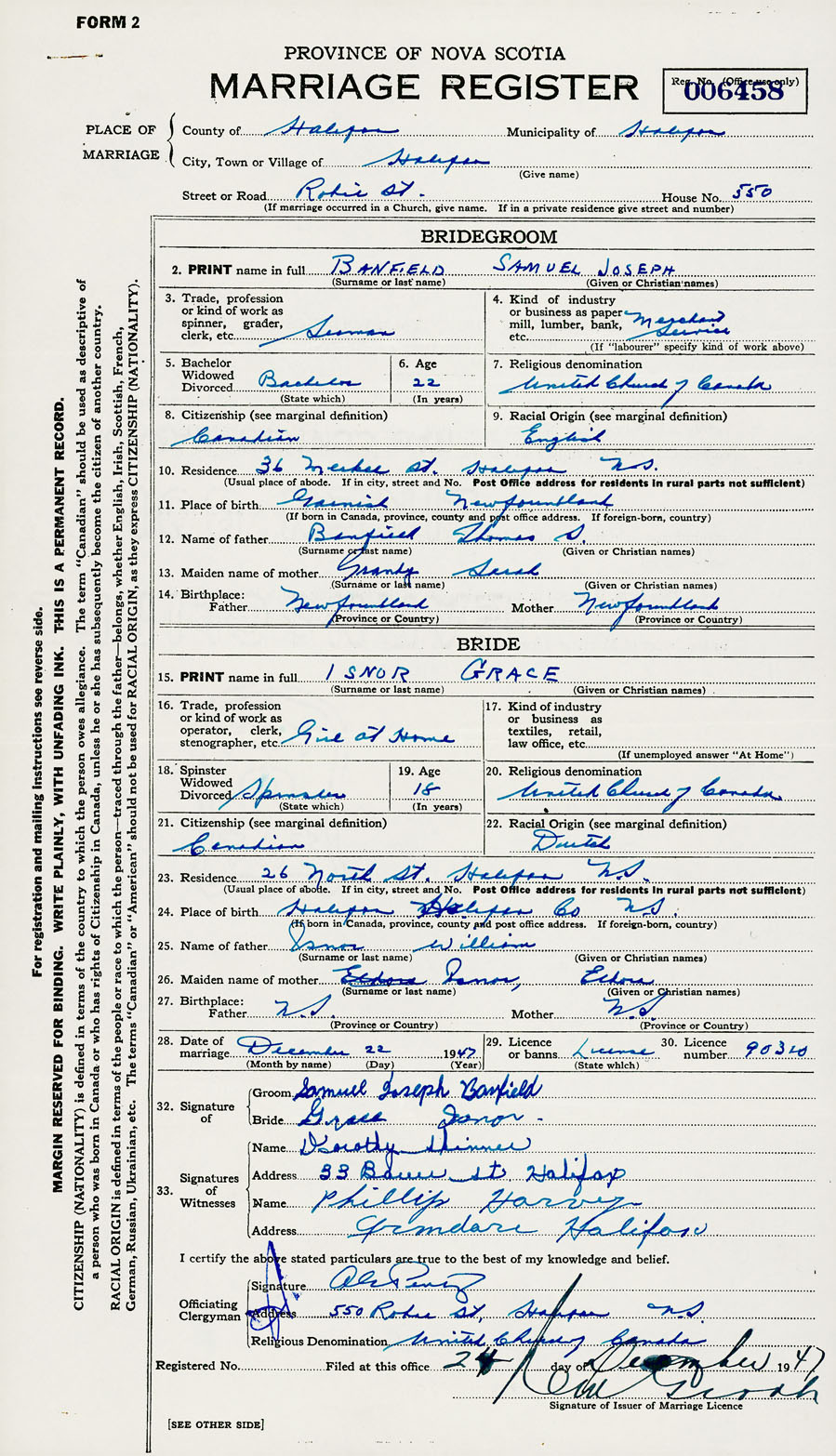 28. Date of marriage December 22 1947 29. By license or banns License 30. License number 95320