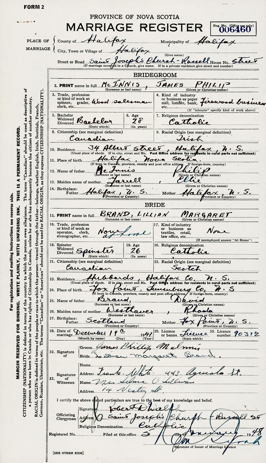 28. Date of marriage December 19 1947 29. By license or banns License 30. License number 90312