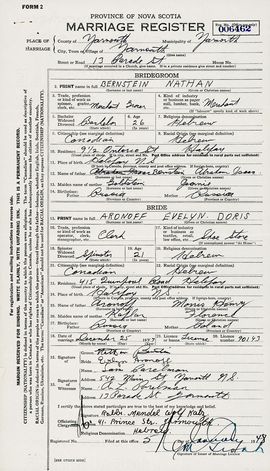 28. Date of marriage December 25 1947 29. By license or banns License 30. License number 90143