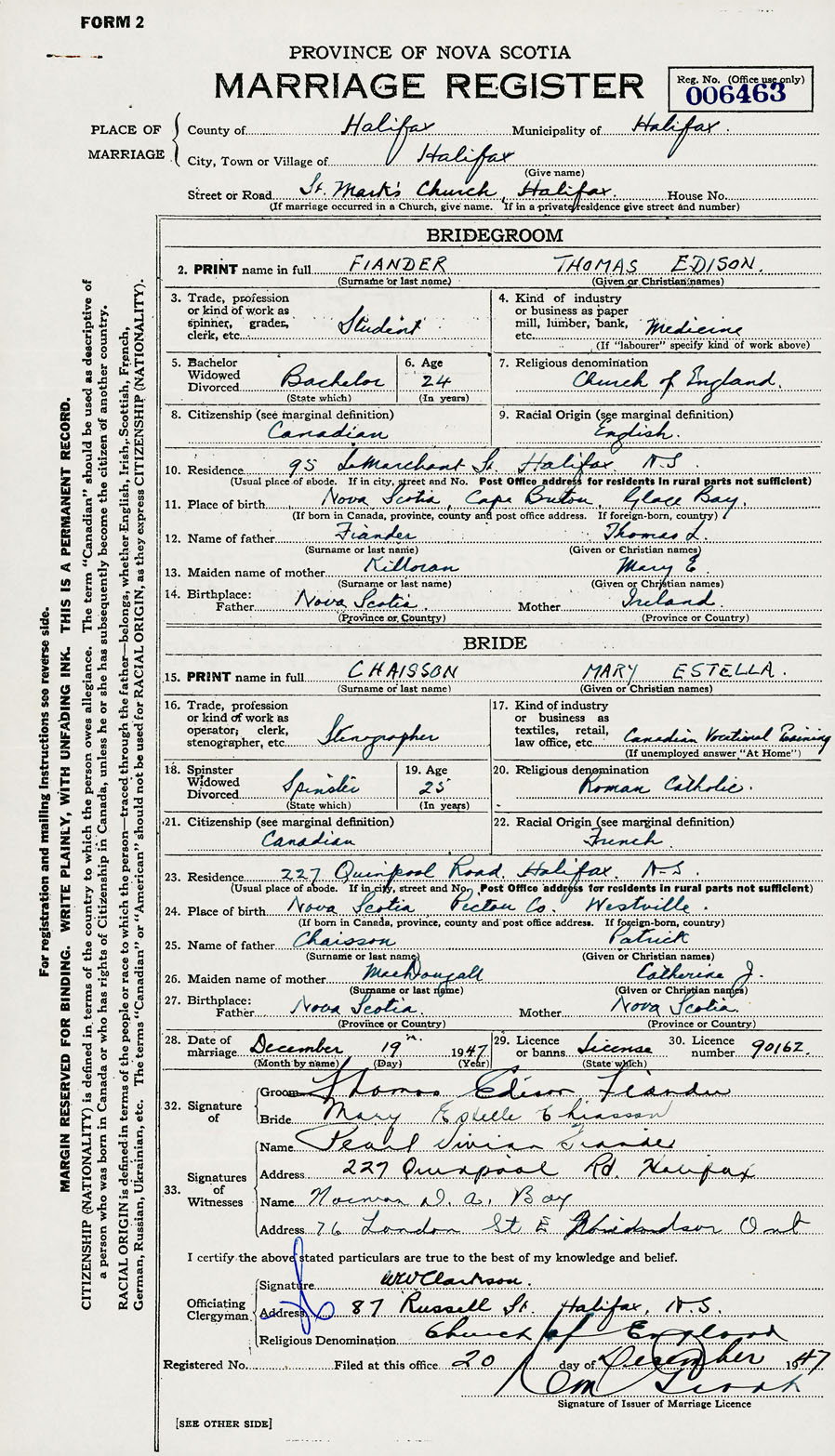 28. Date of marriage December 19 1947 29. By license or banns License 30. License number 90162