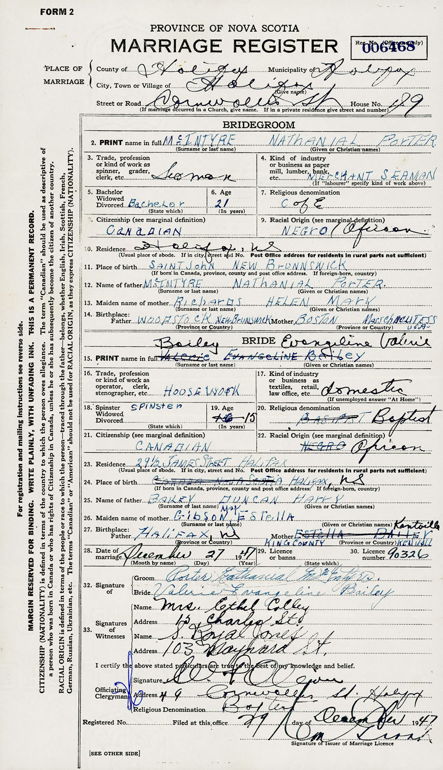 21. Citizenship Canadian 22. Racial origin Negro (African)