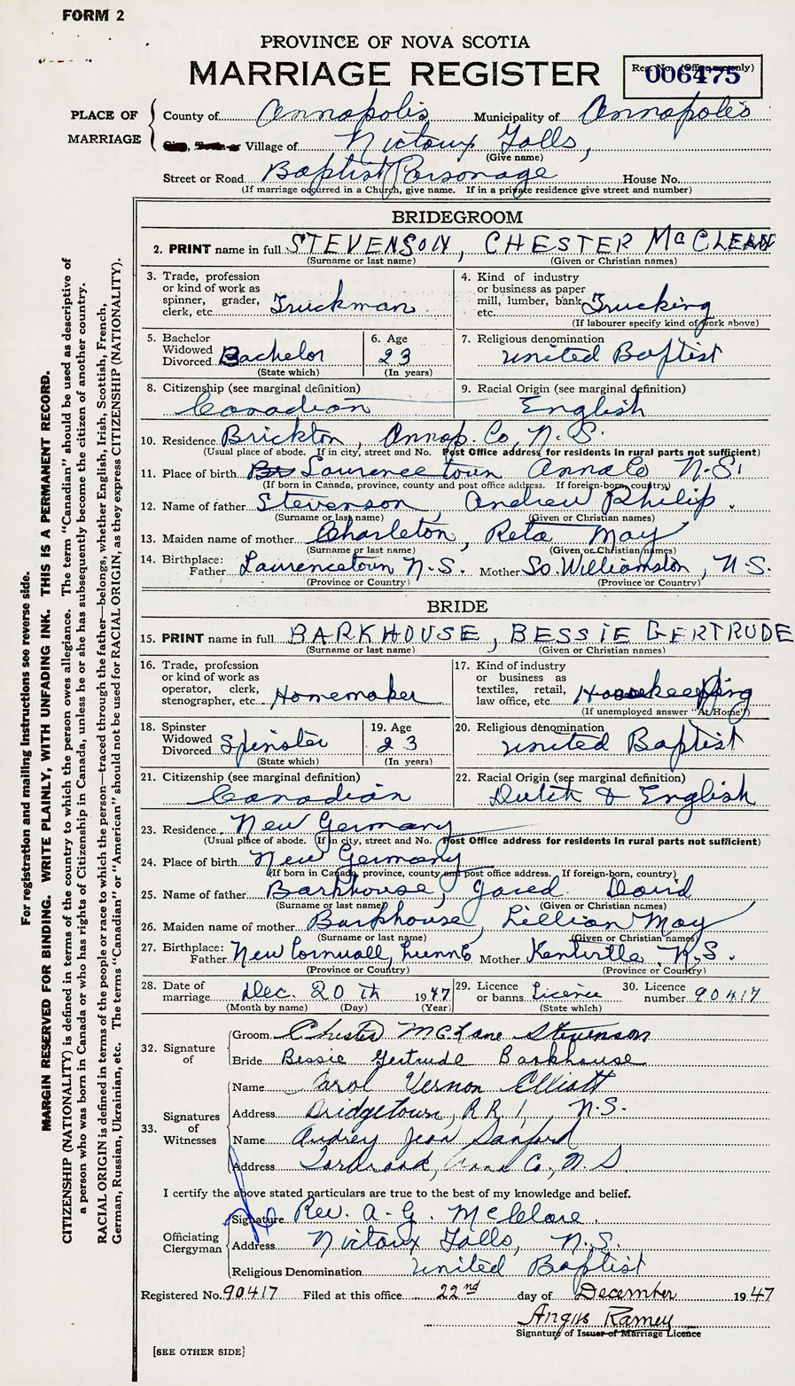28. Date of marriage December 20 1947 29. By license or banns License 30. License number 90417