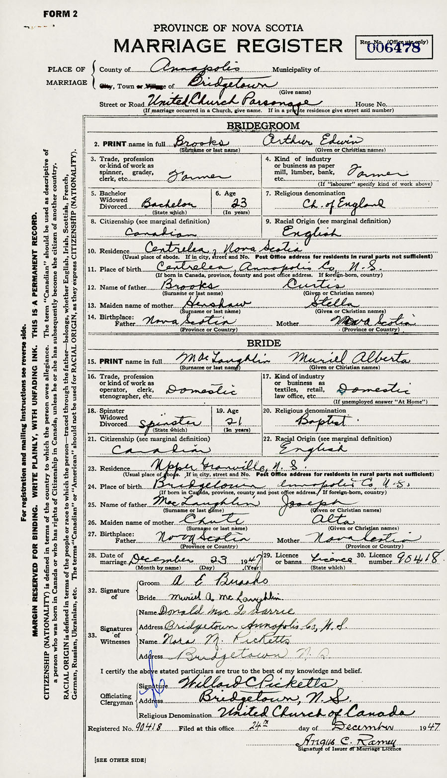 24. Place of birth Bridgetown, Annapolis County, Nova Scotia