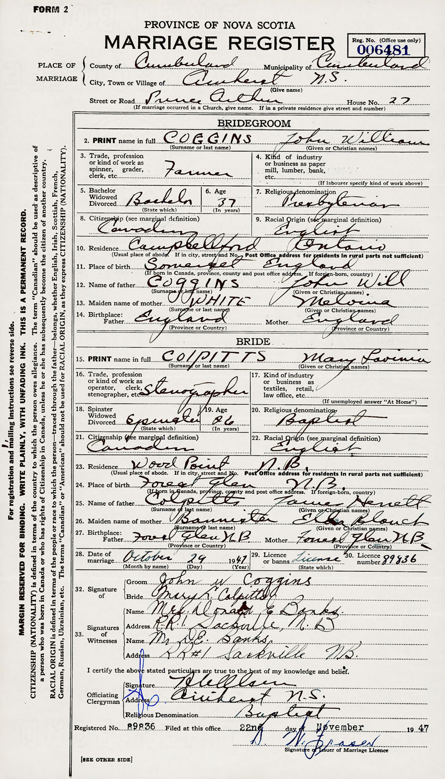 28. Date of marriage October 29 1947 29. By license or banns License 30. License number 89836