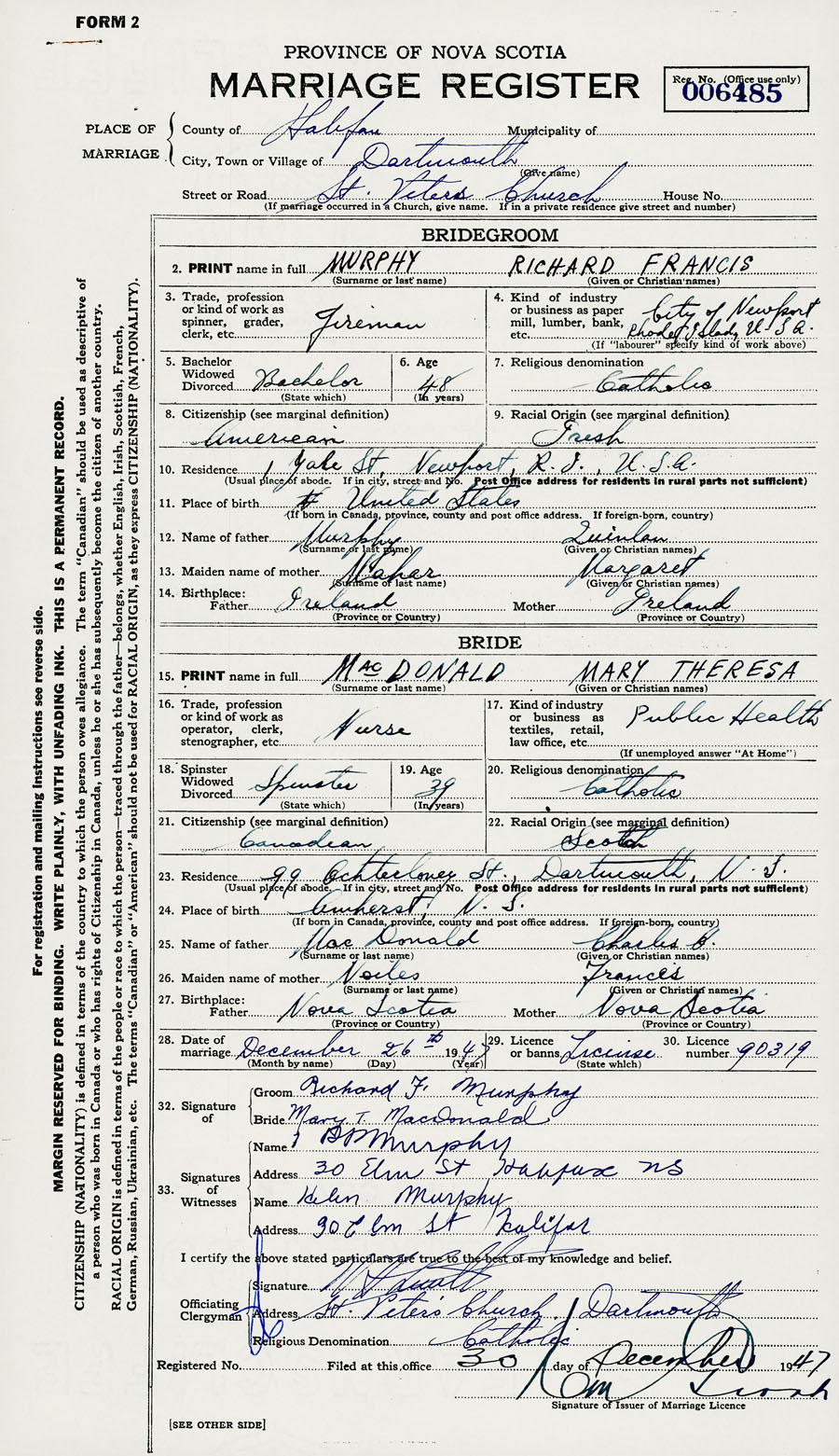 28. Date of marriage December 26 1947 29. By license or banns License 30. License number 90319
