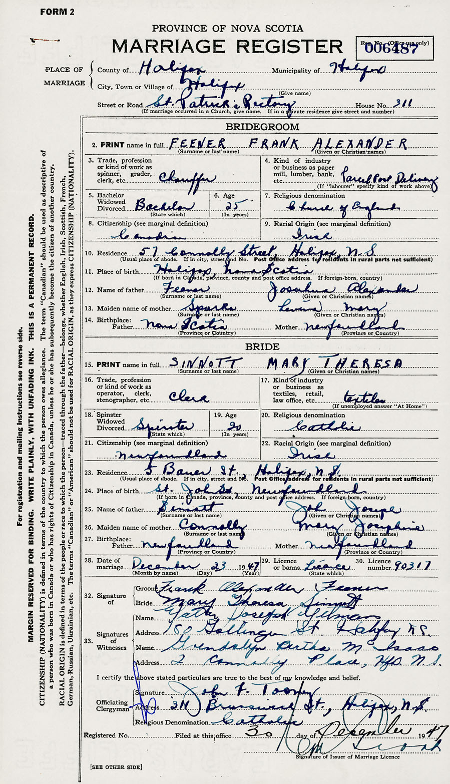 28. Date of marriage December 23 1947 29. By license or banns License 30. License number 90317