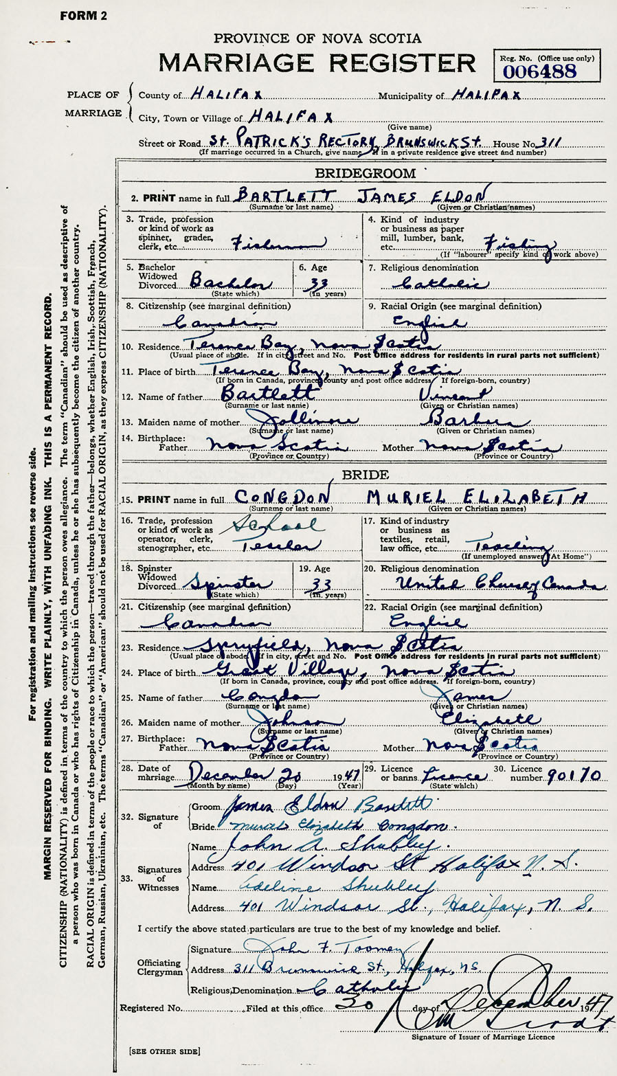 28. Date of marriage December 20 1947 29. By license or banns License 30. License number 90170