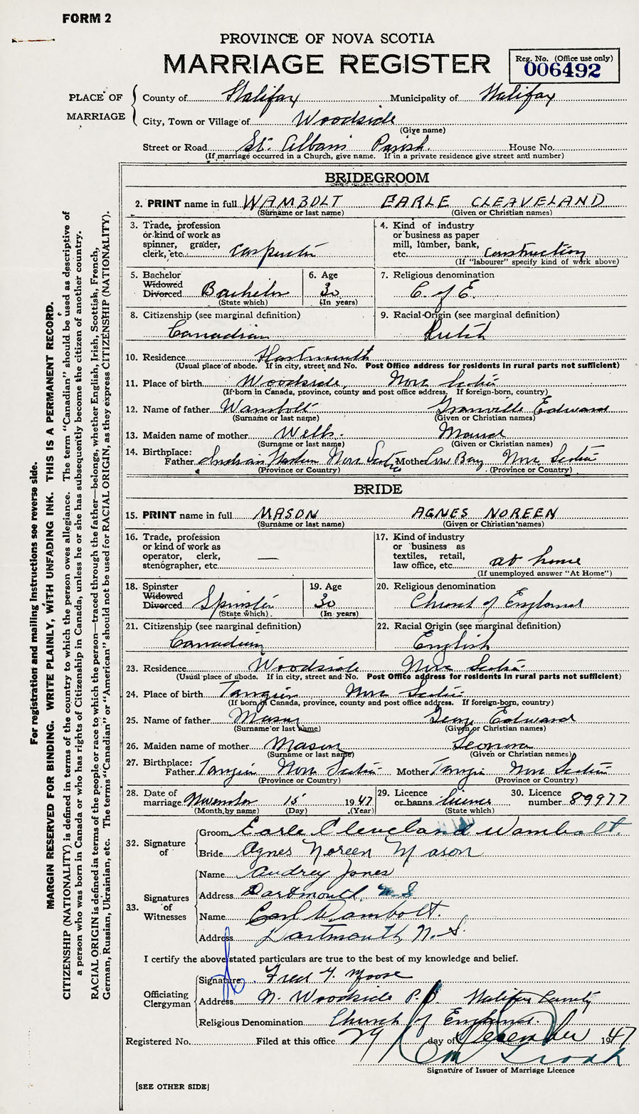 28. Date of marriage November 15 1947 29. By license or banns License 30. License number 89977