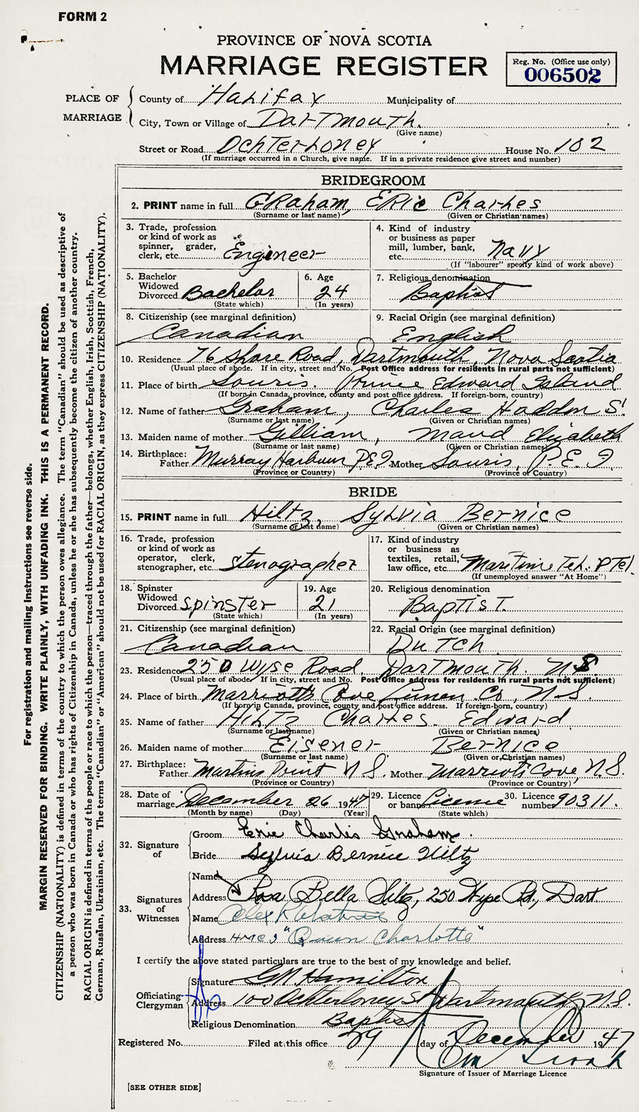28. Date of marriage December 26 1947 29. By license or banns License 30. License number 90311