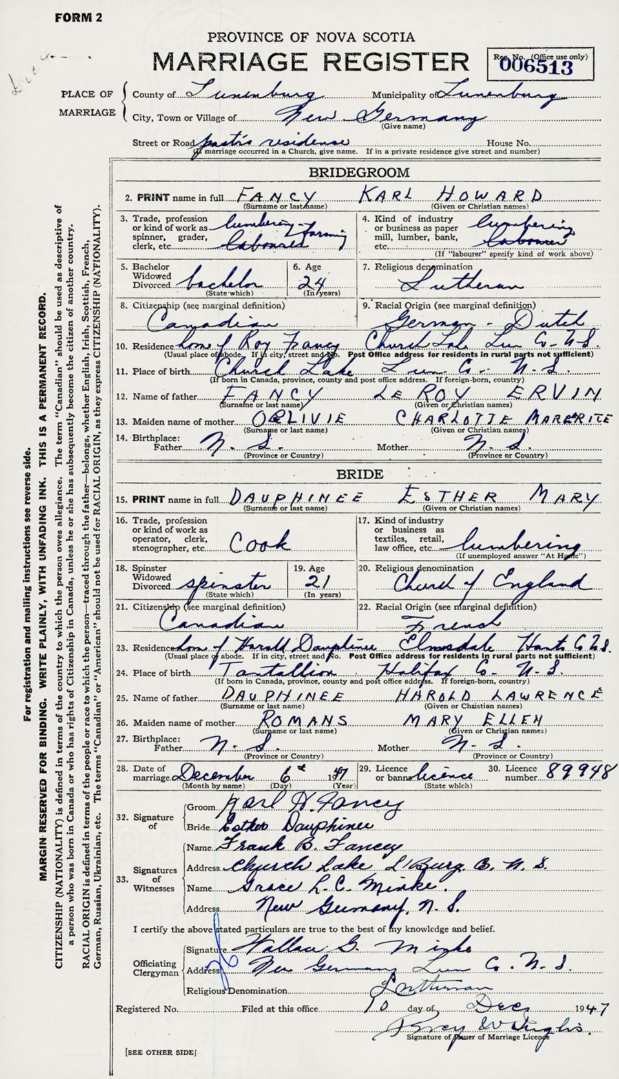 28. Date of marriage December 6 1947 29. By license or banns License 30. License number 89948