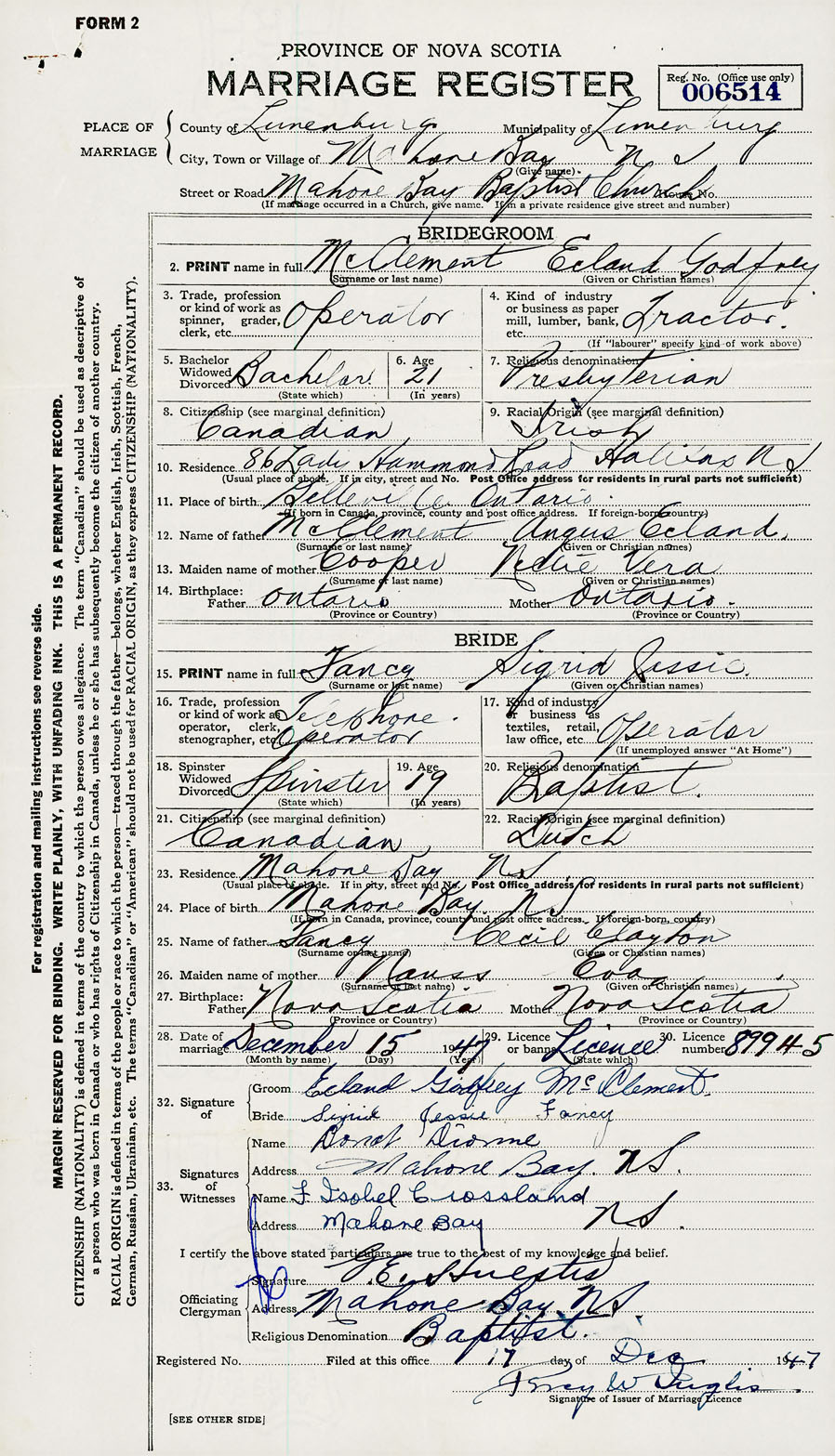 28. Date of marriage December 15 1947 29. By license or banns License 30. License number 89945