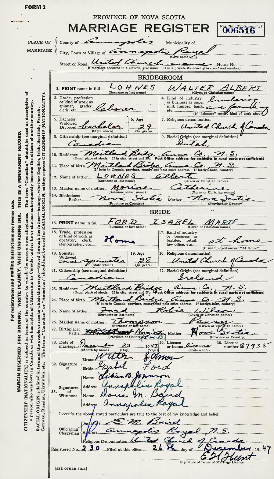 28. Date of marriage December 23 1947 29. By license or banns License 30. License number 87935