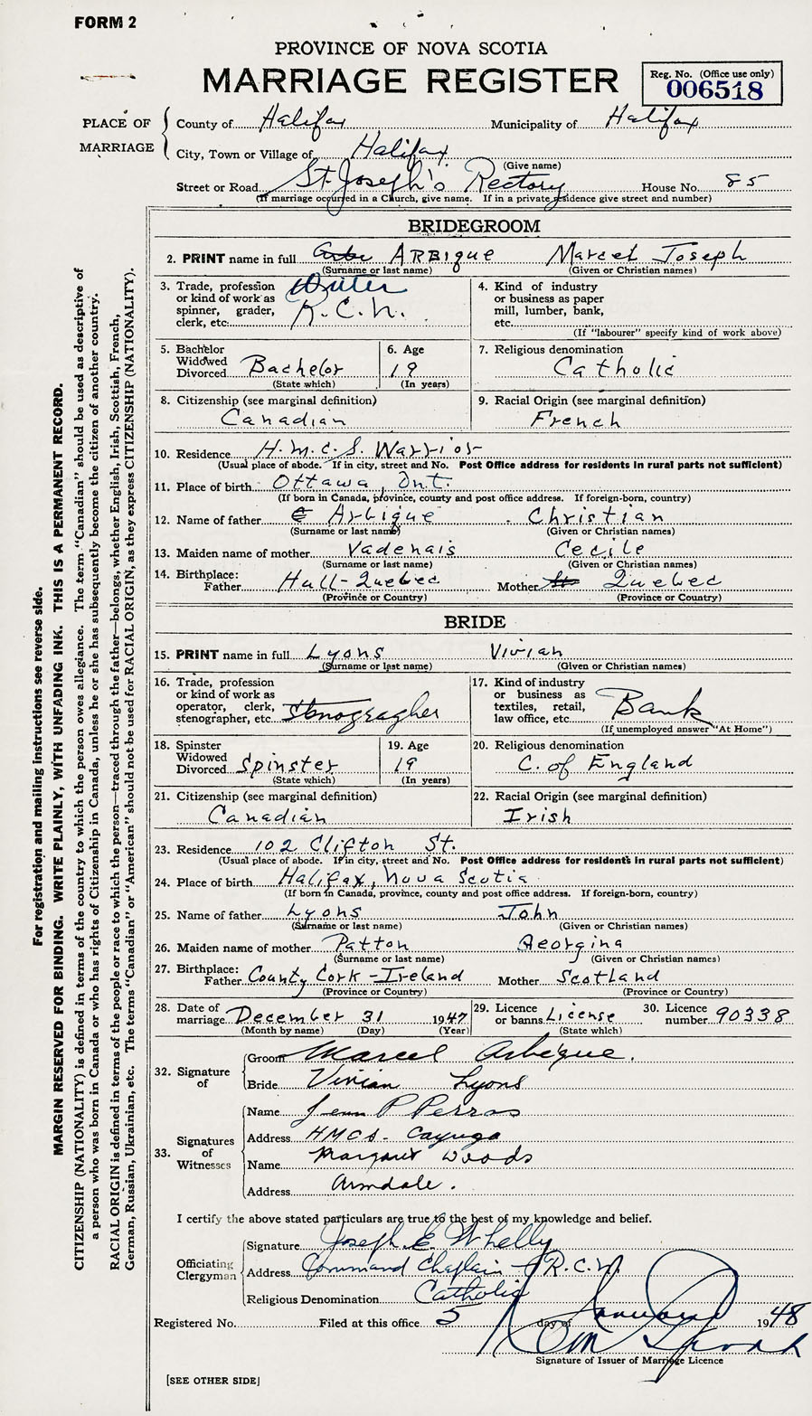 28. Date of marriage December 31 1947 29. By license or banns License 30. License number 90338