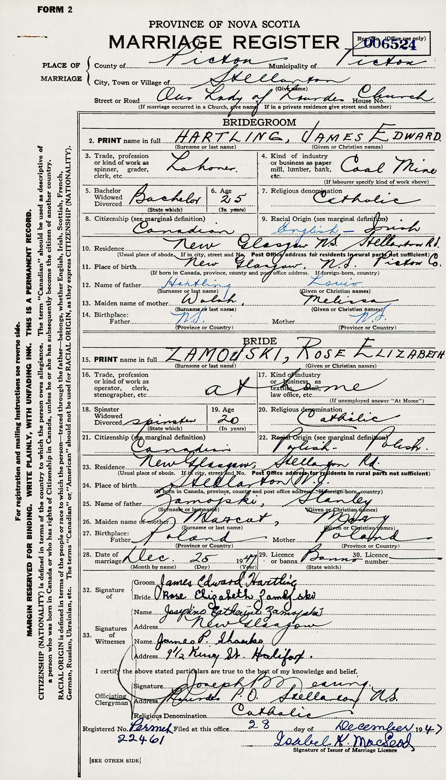 28. Date of marriage December 25 1947 29. By license or banns License 30. License number