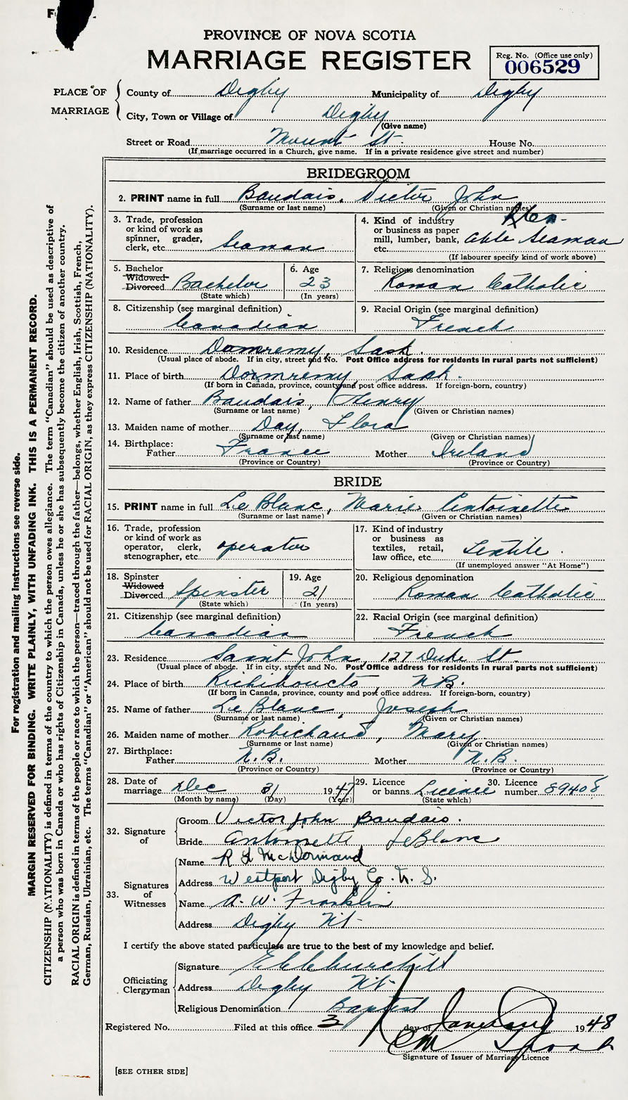 28. Date of marriage December 31 1947 29. By license or banns License 30. License number 89408