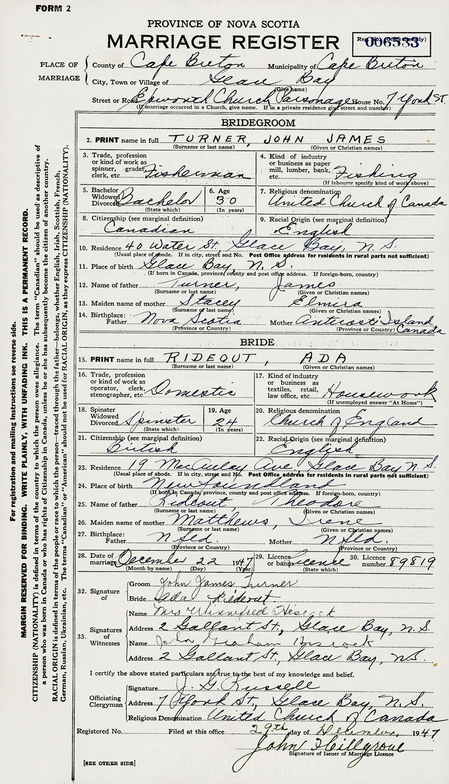 28. Date of marriage December 22 1947 29. By license or banns License 30. License number 89819