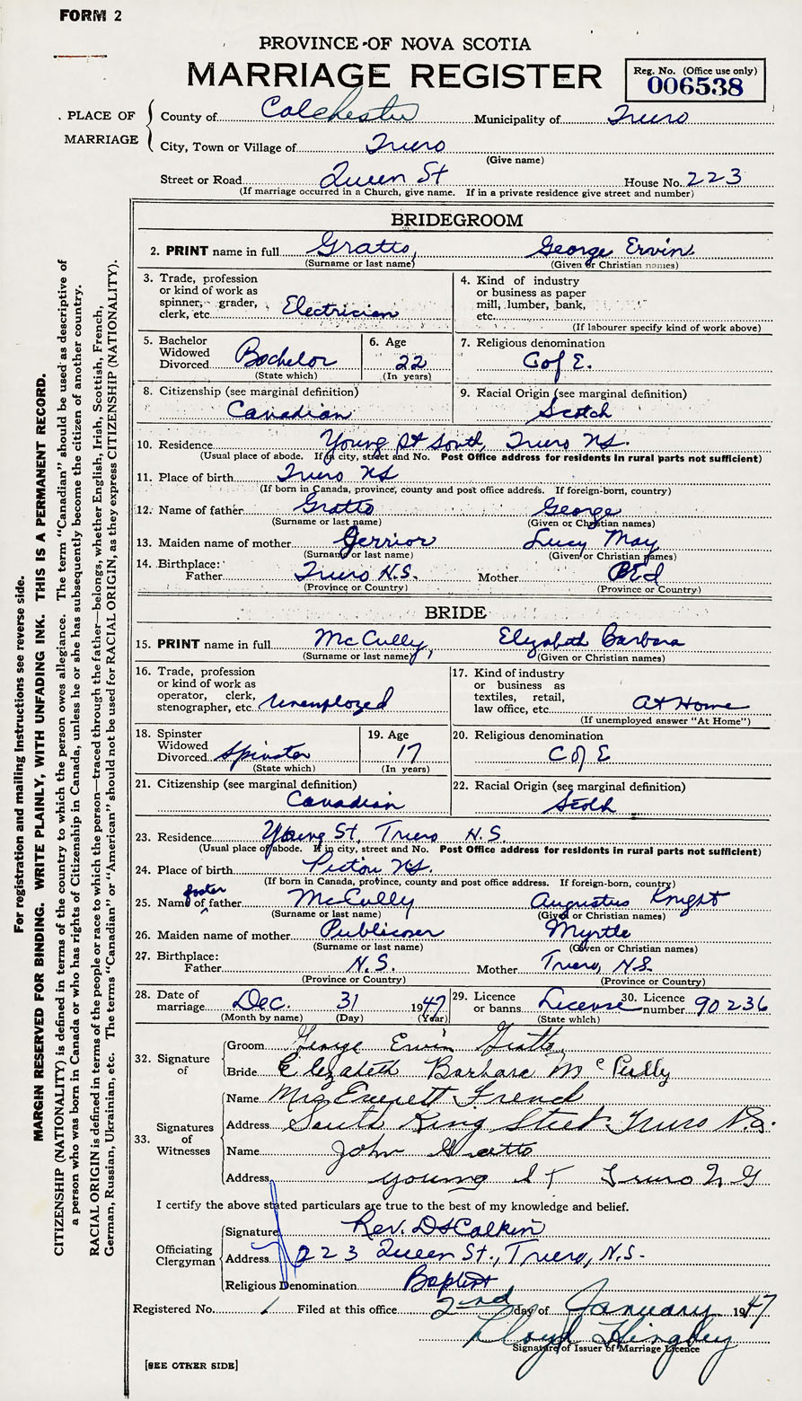 28. Date of marriage December 31 1947 29. By license or banns License 30. License number 90236