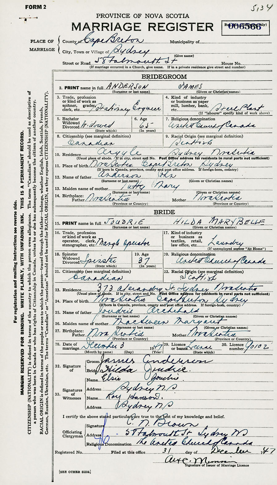 28. Date of marriage December 3 1947 29. By license or banns License 30. License number 90102