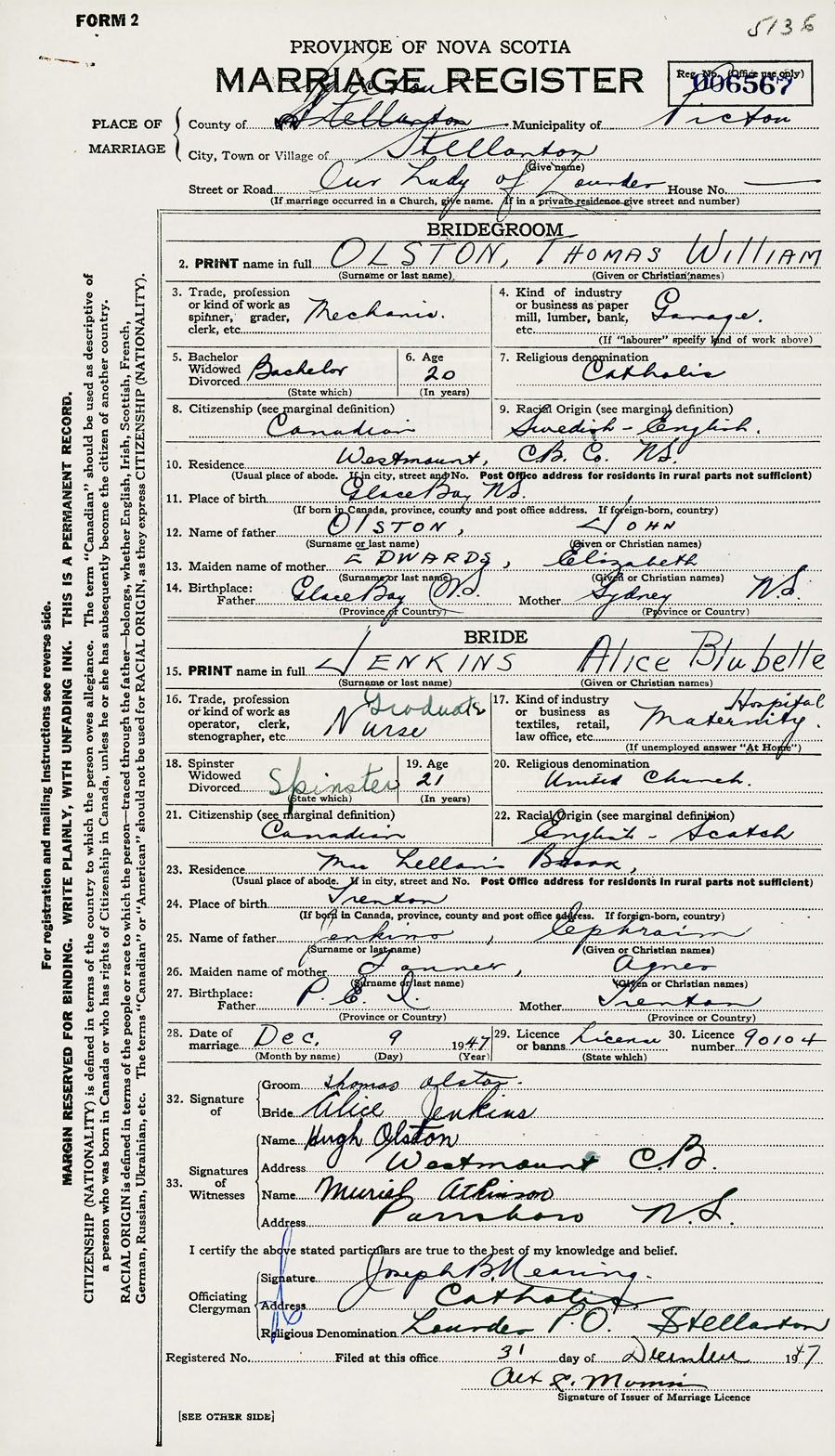 28. Date of marriage December 9 1947 29. By license or banns License 30. License number 90104